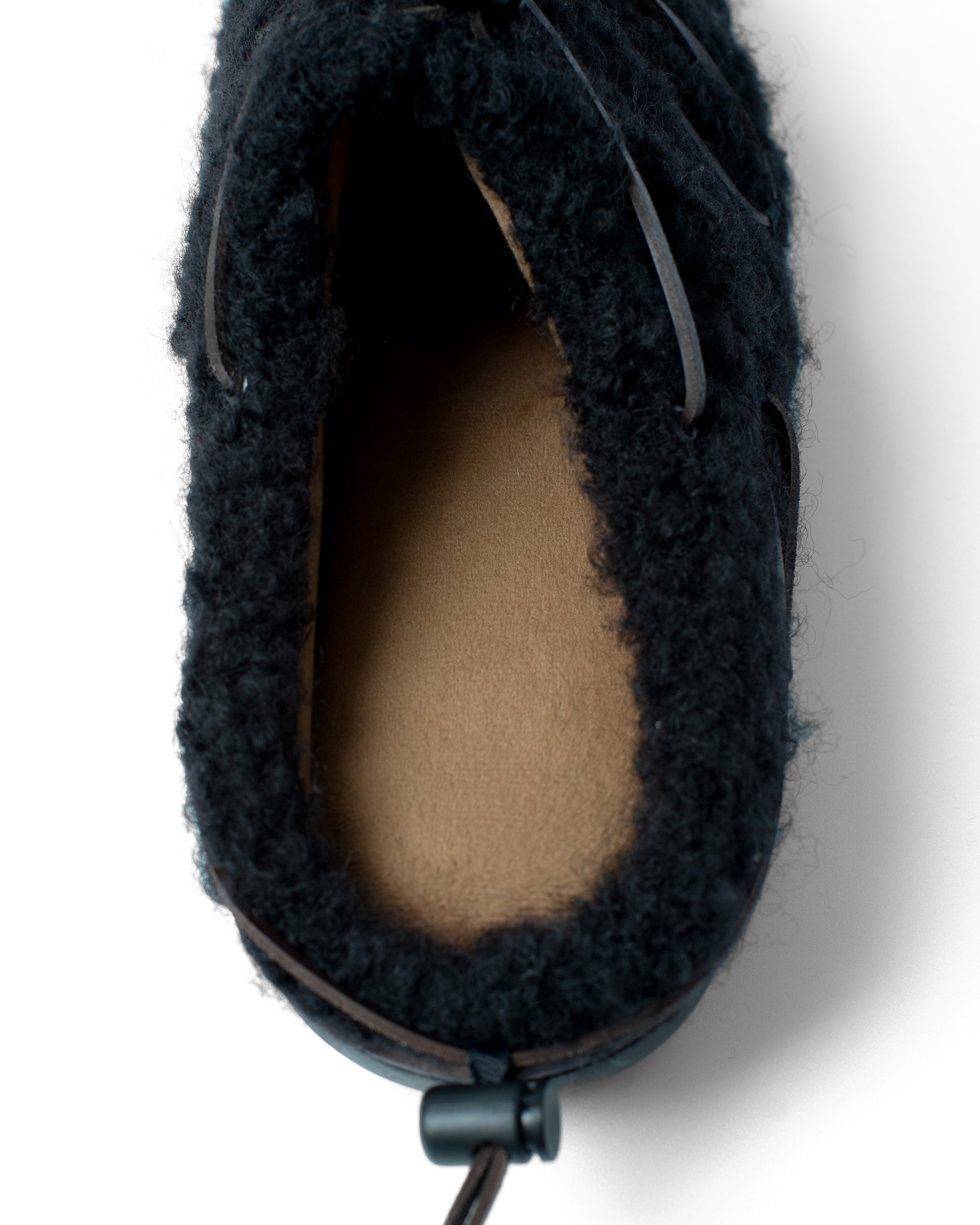 “UNEXPECTED WINTER SANDALS” をテーマに展開する、SUBUとのコラボレーションアイテム。 SUBUのシグネチャーモデル「F-LINE」をベースに、暖かみのあるウールボア素材を採用。 本革のロープを巻き付けたような独自のデザインは、かつて職人たちが、うっ血を防ぎ、長距離を楽に走るために足に巻いた“血止め”から着想。古き知恵を、現代の冬の足元にアクセントとして宿した一足となっています。