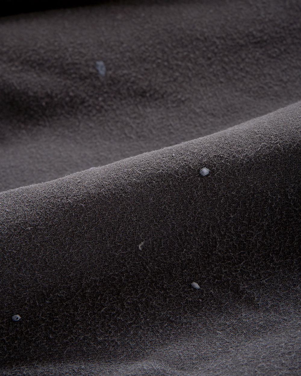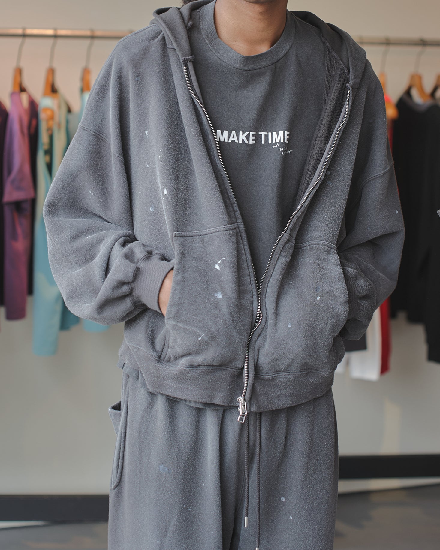 若手職人をイメージして制作した、ジップアップフーディ。祖父が口にした「熟練の職人は作業着を汚さない」という一言をきっかけに、 まだ“動き”の多い若手職人の汚れた作業着をモチーフとして制作しました。生地は70〜80年代の素材をイメージしたレーヨン混裏毛を使用。ペンキを多くを施したユーズド加工で仕上げています。経験の跡をイメージしたペイントが特徴的。