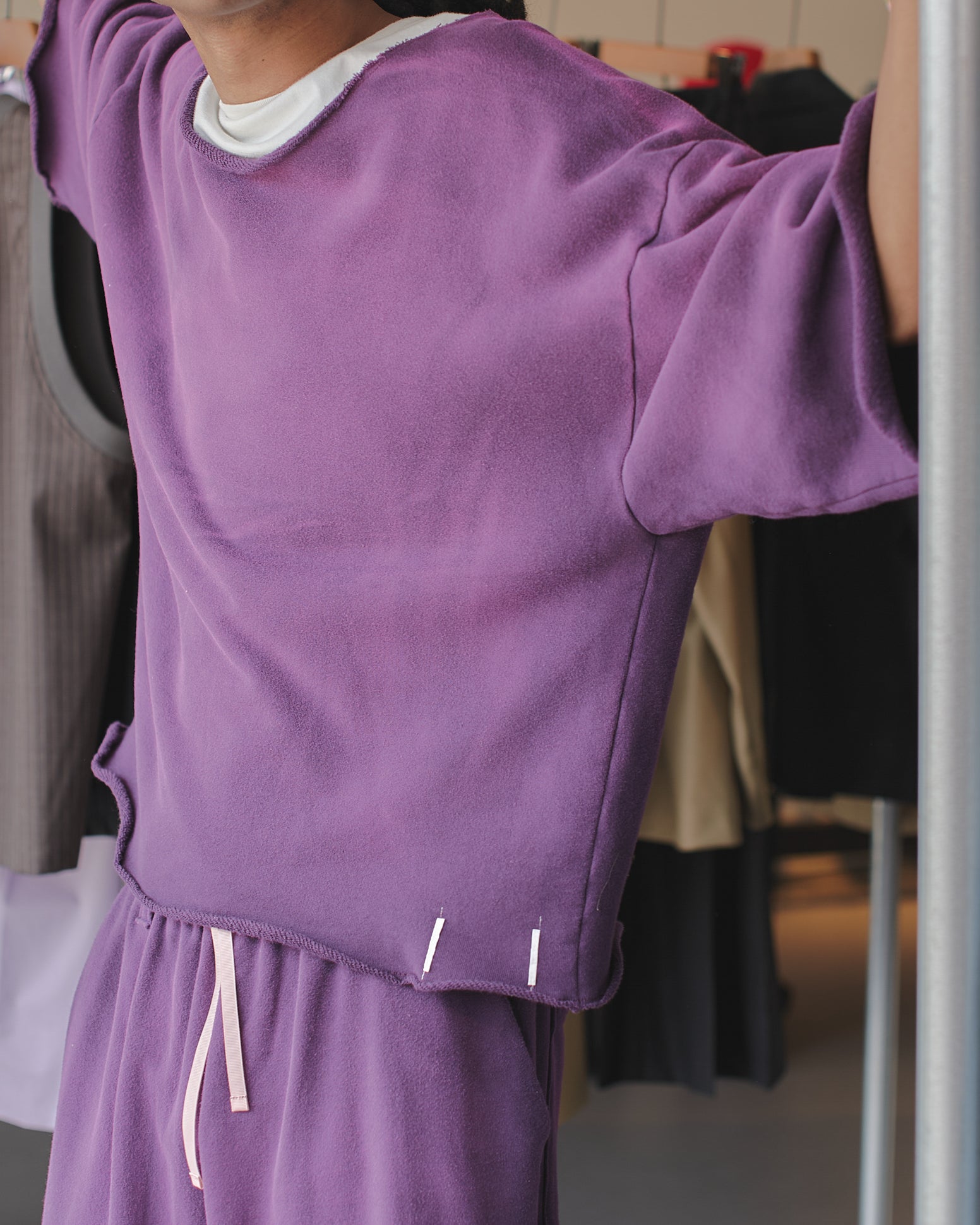 着古した様な風合いを表現する為に通常の加工工程を繰り返し行なった半袖プルオーバー。カラーバリエーションが豊富です。生地は旧式の編機で製作された裏毛を使用。カットオフのデザインが特徴的。同シリーズでのセット着用が可能。