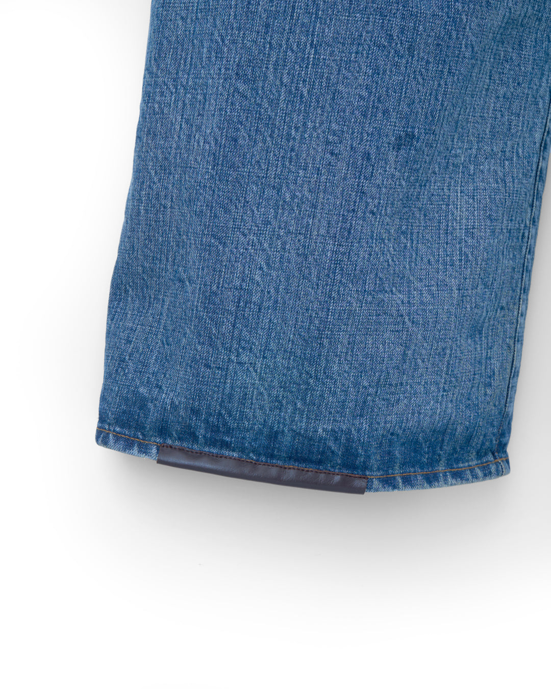 大きいウエストと、裾のプロテクターをイメージしたレザーパッチが特徴の新型パンツです。 縦落ちデニムを使用し、経年変化による表情の変化を楽しめる仕上がりに。穿き込むほどに風合いが増し、独特の味わいが生まれる。