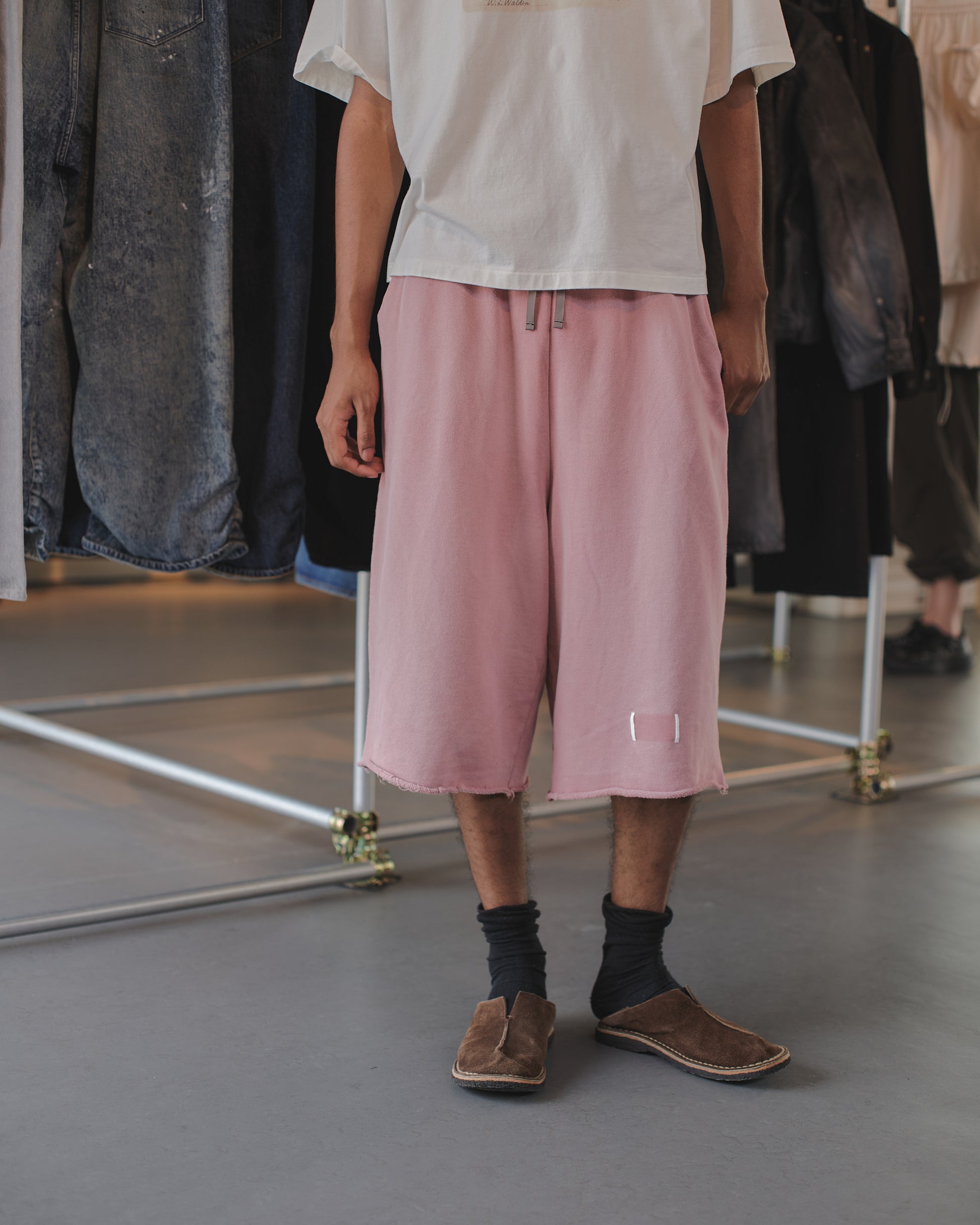 着古した様な風合いを表現する為に通常の加工工程を繰り返し行なったショートパンツ。カラーバリエーションが豊富で、生地は旧式の編機で製作された裏毛を使用。カットオフのデザインが特徴的で、同シリーズでのセット着用が可能。